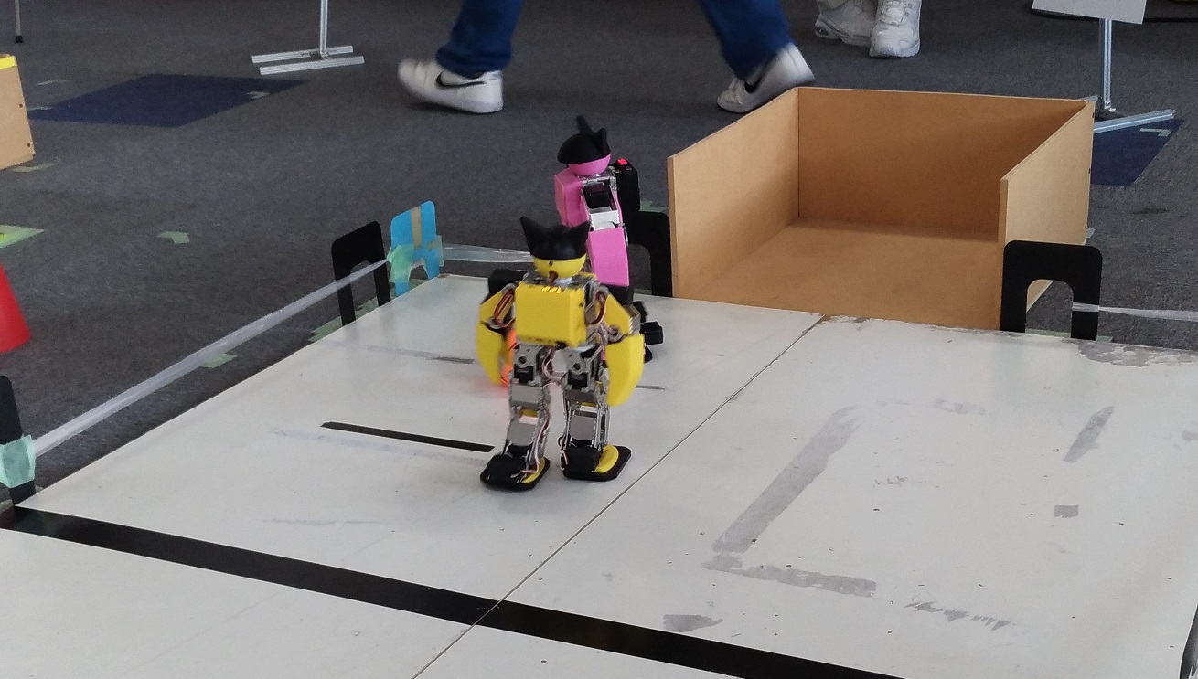 第二競技のサッカーは少しコートが狭いな~と感じました。コートの中に5台(3対2)もロボットがいるので、あんまり動けませんでした。